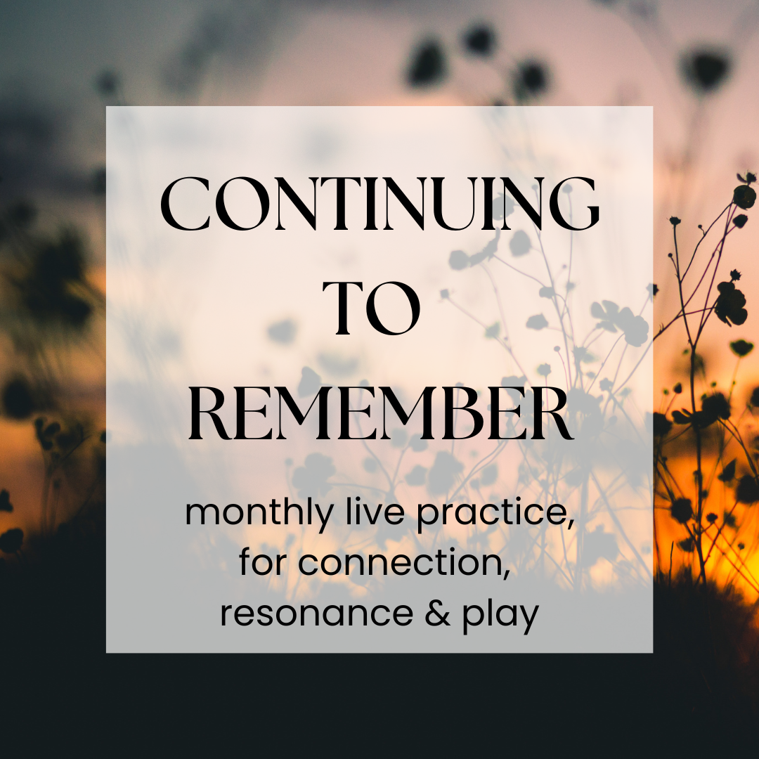 'Continuing to Remember' is a follow-on monthly live somatic practice space, so that you can continue to experience connection, resonance & celebration within a supportive community. For anyone who has completed one of the somatic workshops here, or is in practice with me as a one-to-one client.